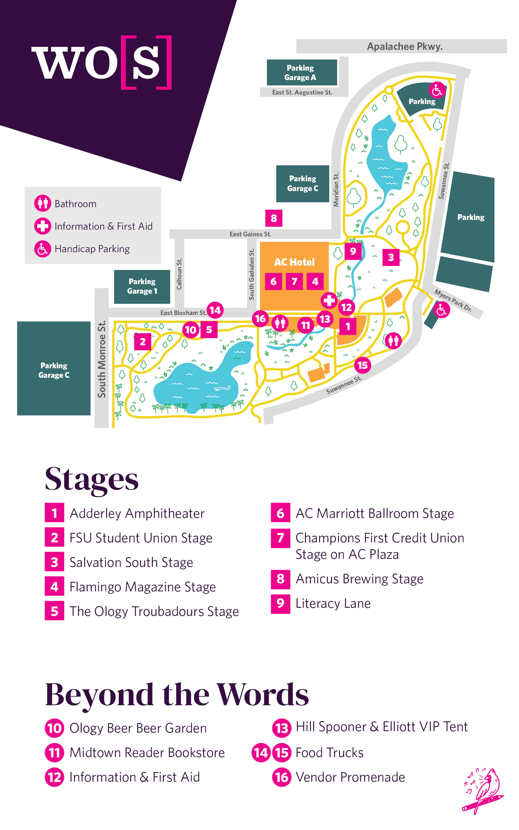 Please see the adjacent venue map for parking areas. All State of Florida parking lots and garages labeled here are free and open Word of South weekend starting 6pm Friday and through Sunday.